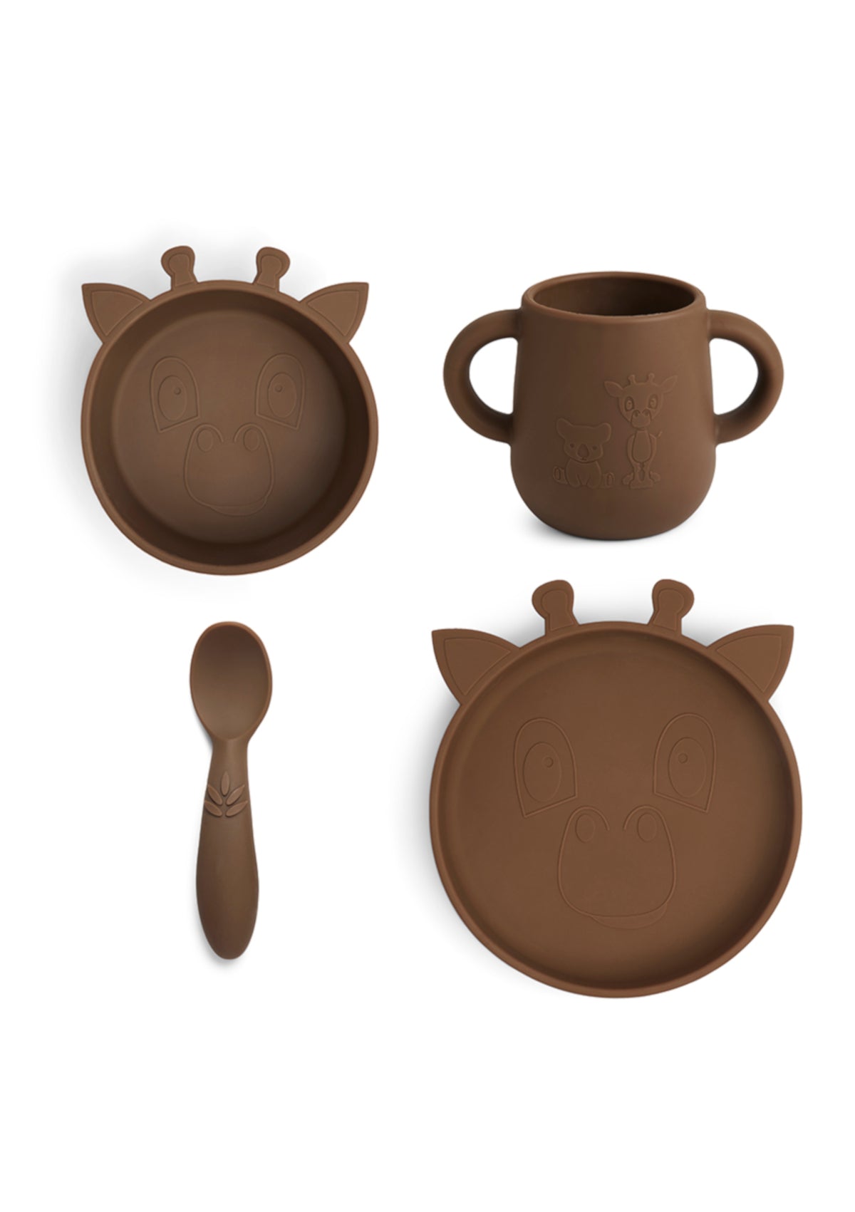 Conjunto de 4 peças de silicone: prato raso, prato fundo, copo e colher – todos com formato de girafa. As quatro peças são feitas de silicone certificado LFGB sem quaisquer produtos químicos nocivos. O silicone é macio e prático, pois pode ser lavado na máquina de lavar louça, não quebra e tem alta durabilidade.
